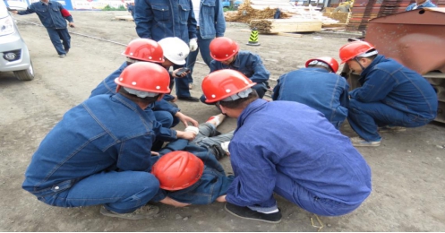 演練共分為參加演練人員集結(jié)、現(xiàn)場模擬人員受傷、采取止血包扎處理、現(xiàn)場管理人員發(fā)現(xiàn)事故后立即向指揮組匯報(bào)情況、指揮組接到通知后立即組織現(xiàn)場救援、各應(yīng)急小組迅速趕往事故地點(diǎn)、應(yīng)急救護(hù)組對(duì)傷者進(jìn)行簡單救護(hù)后將傷者送往醫(yī)院、事故處理組對(duì)事故進(jìn)行初步調(diào)查等過程。