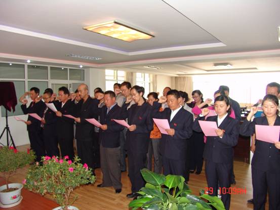 我宣誓:"我志愿加入中國共產(chǎn)黨,擁護(hù)黨的綱領(lǐng),遵守黨的章程,履行黨員義務(wù),執(zhí)行黨的決定,嚴(yán)守黨的紀(jì)律,保守黨的秘密,對黨忠誠,積極工作,為共產(chǎn)主義奮斗終身,隨時(shí)準(zhǔn)備為黨和人民犧牲一切,永不叛黨"。6月29日上午10∶00時(shí),17名新加入黨組織的中國共產(chǎn)黨預(yù)備黨員、所屬各黨組織書記、老黨員代表等30余人的莊嚴(yán)宣誓,標(biāo)志著青海物產(chǎn)系統(tǒng)慶祝建黨91周年系列活動正式展開。